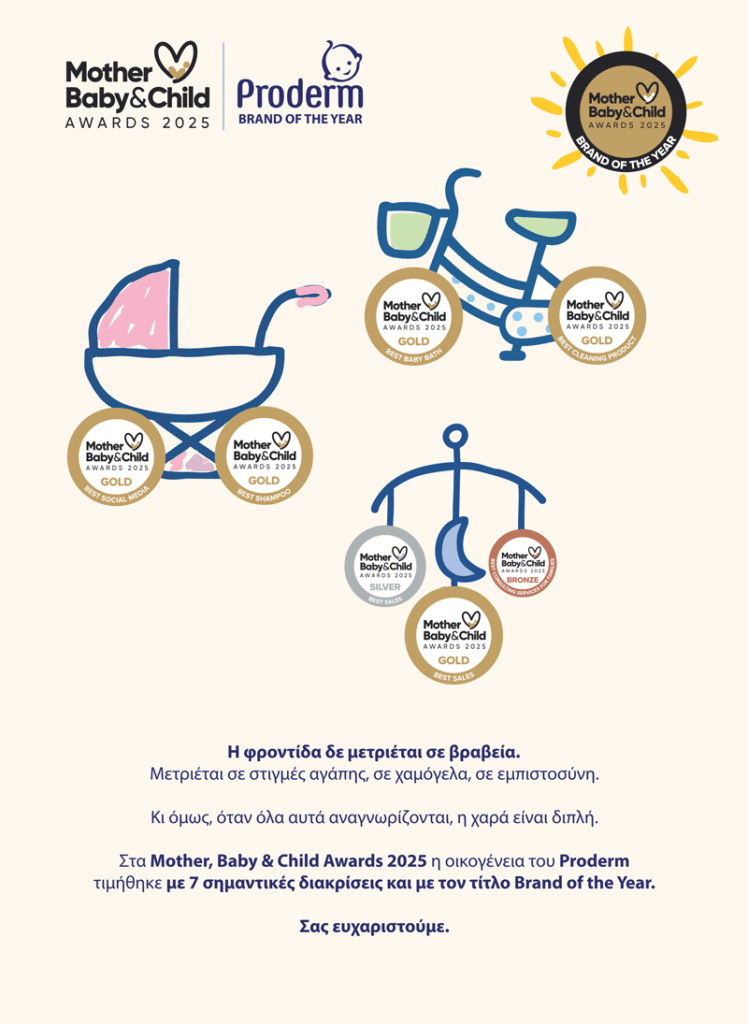 Τη Δευτέρα 15 Σεπτεμβρίου 2025, το Proderm ξεχώρισε στα «Mother, Baby & Child Awards 2025», αποσπώντας συνολικά 8 βραβεία, με κορυφαίο το «Brand of the Year». Για περισσότερα από 60 χρόνια, το Proderm βρίσκεται δίπλα στις ελληνικές οικογένειες, μεγαλώνοντας γενιές και γενιές με στοργή. Η φετινή διάκριση έρχεται να επιβεβαιώσει αυτή τη μακροχρόνια σχέση εμπιστοσύνης.